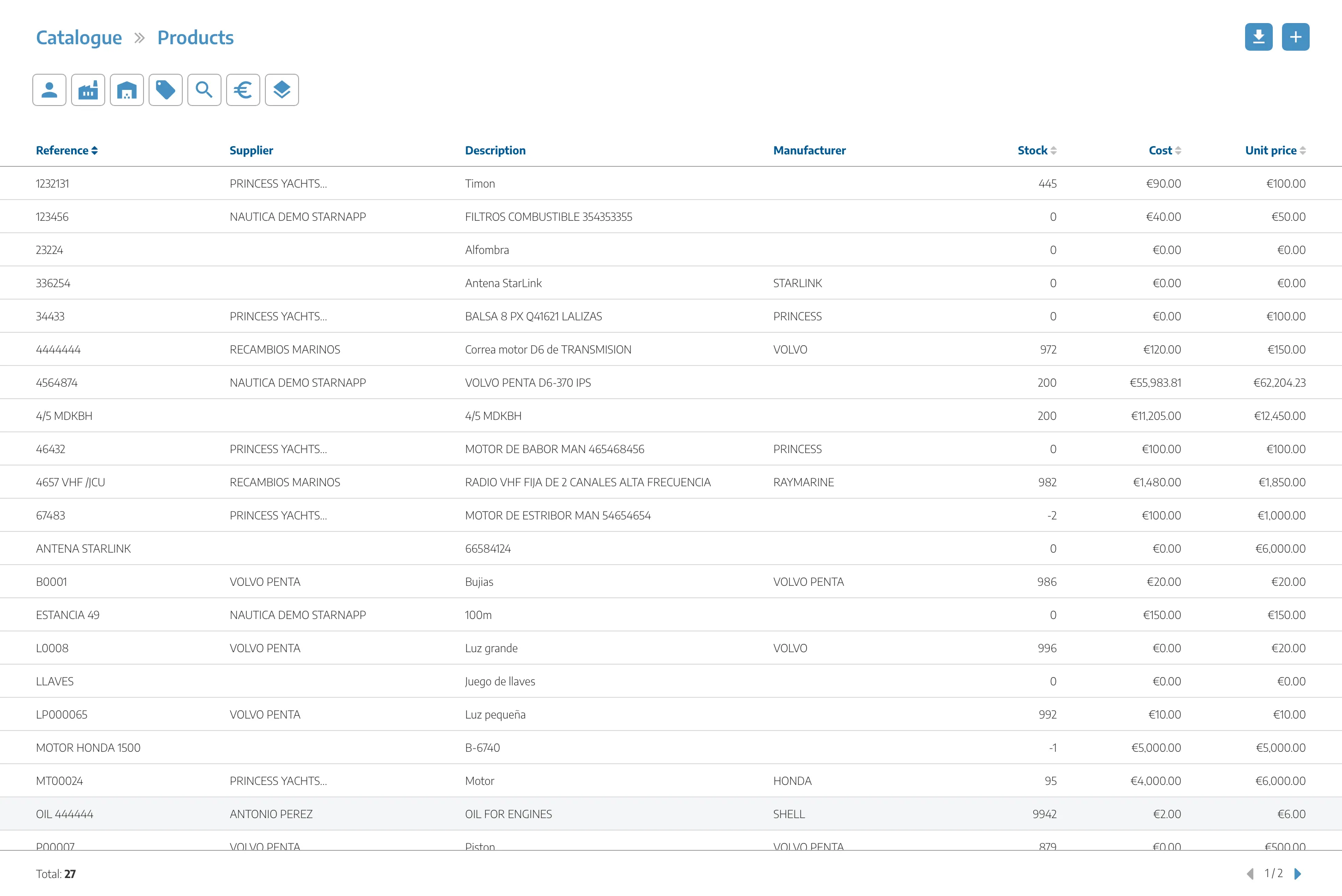 El sistema permite configurar un catálogo organizado que refleje tanto los servicios prestados, como la «instalación de hélices» o la «inspección de la línea de ejes», como los productos vendidos, incluidas las hélices, los ejes, los prensaestopas, los cojinetes y los acoplamientos, entre otros.